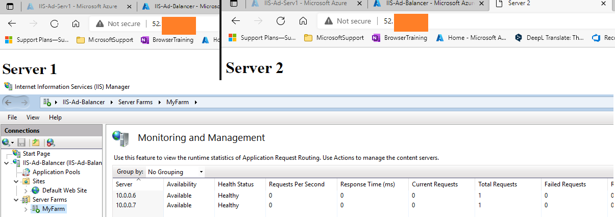 I am going to make two requests to the public IP of the “IIS-Ad-Balancer”. In this case, each VM part of the Server Farm has a 50% chance of receiving a given request.