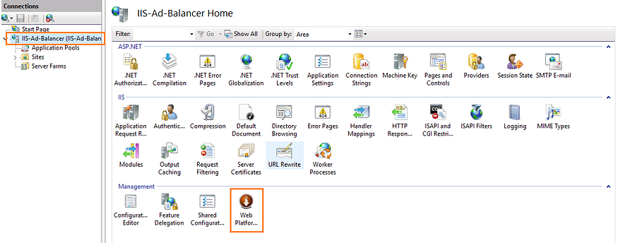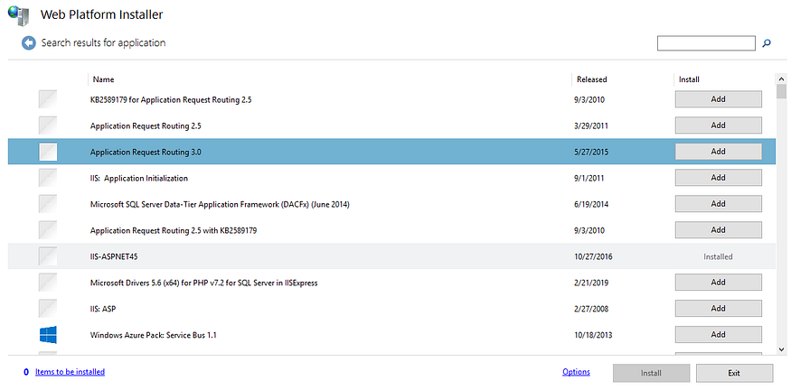 Once installed open IIS Manager and, at the server level open the “Web Platform Installer”, and search for “Application Request Routing 3.0” and install it.