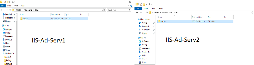 2. Copy and the website’s folder in “IIS-Ad-Serv1” and paste it in “IIS-Ad-Serv2”. It should be pasted under the same location as in “IIS-Ad-Serv1”. Folder (“my-site”) will be located at “C:\Sites” in both VM’s.
